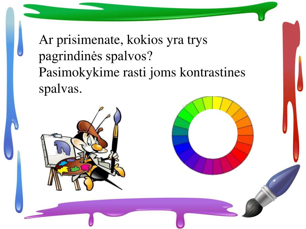Ar prisimenate, kokios yra trys pagrindinės spalvos?Pasimokykime rasti joms kontrastines spalvas.