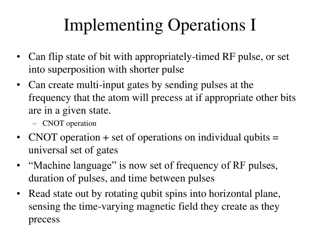 Implementing Operations I • Can flip state of bit with appropriately-timed RF pulse, or set into superposition with shorter pulse • Can create multi-input gates by sending pulses at the frequency that the atom will precess at if appropriate other bits are in a given state. • CNOT operation • CNOT operation + set of operations on individual qubits = universal set of gates • “Machine language” is now set of frequency of RF pulses, duration of pulses, and time between pulses • Read state out by rotating qubit spins into horizontal plane, sensing the time-varying magnetic field they create as they precess