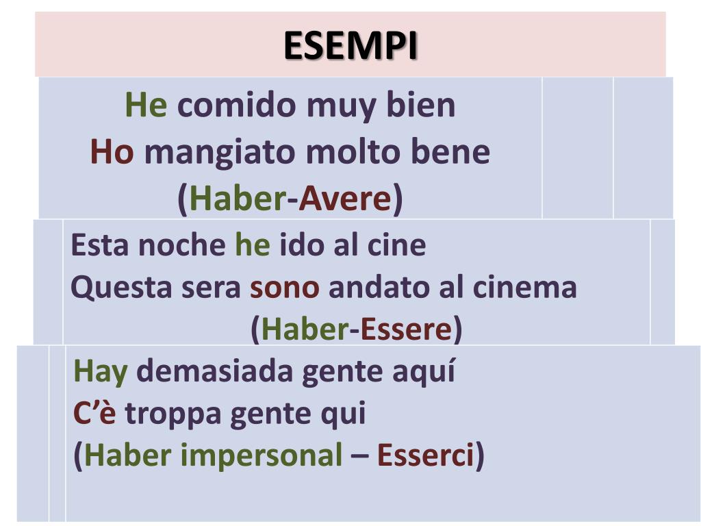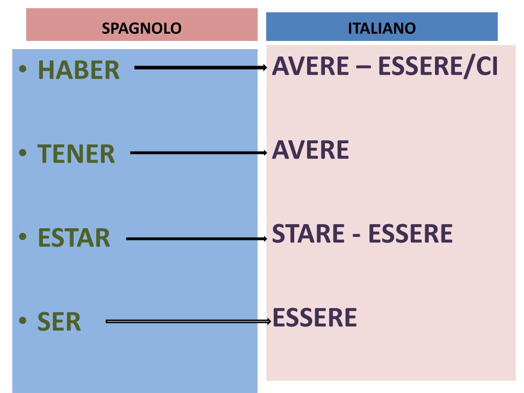 SPAGNOLO AVERE (possesso) AVERE (ausiliare) ESSERE/CI STARE ITALIANO TENER HABER SER-ESTAR-HABER ESTAR