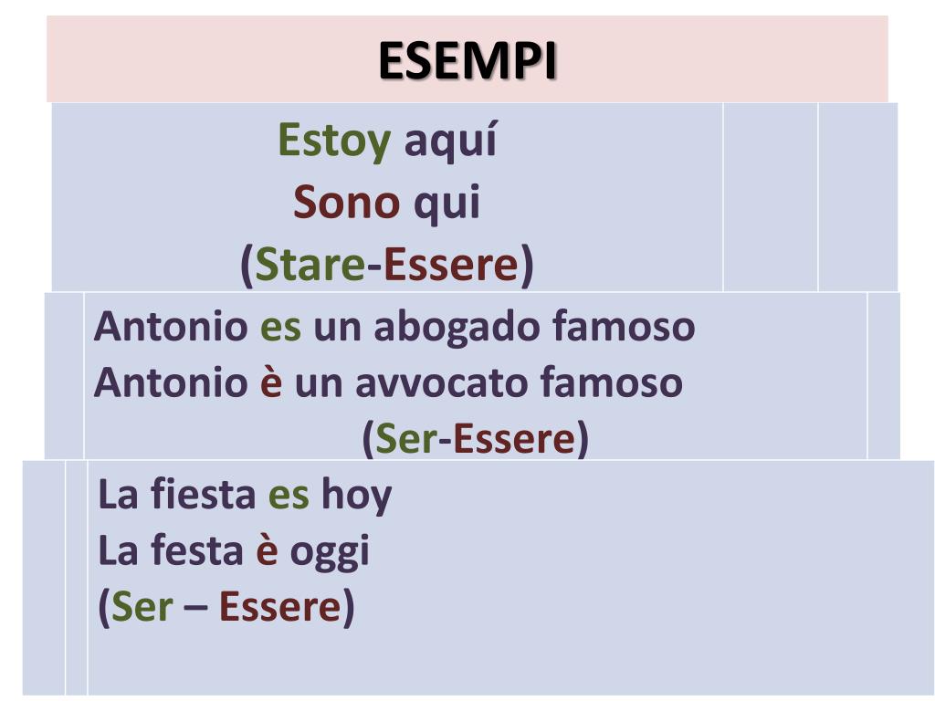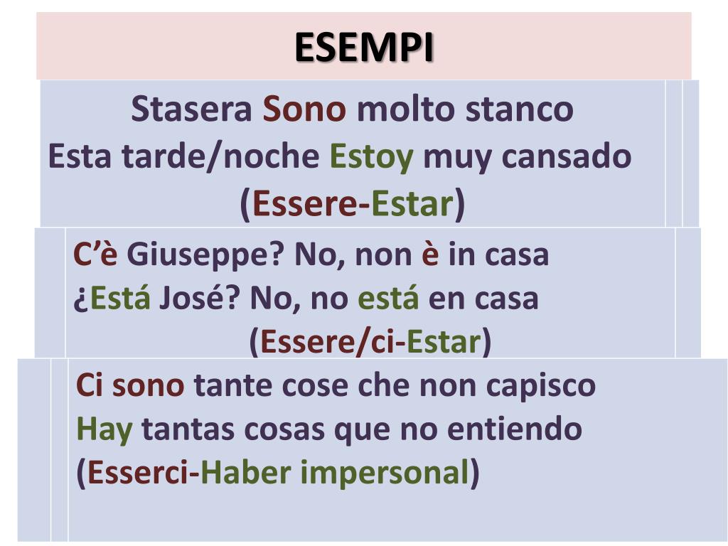 HABER TENER SER ESTAR. SPAGNOLO. AVERE – ESSERE/ CI AVERE STARE - ESSERE ESSERE. ITALIANO. HABER TENER ESTAR SER. ESEMPI. ESEMPI. ESEMPI. SPAGNOLO. AVERE (possesso) AVERE (ausiliare) ESSERE/ CI STARE. ITALIANO. TENER HABER SER-ESTAR-HABER ESTAR. ESEMPI. ESEMPI.