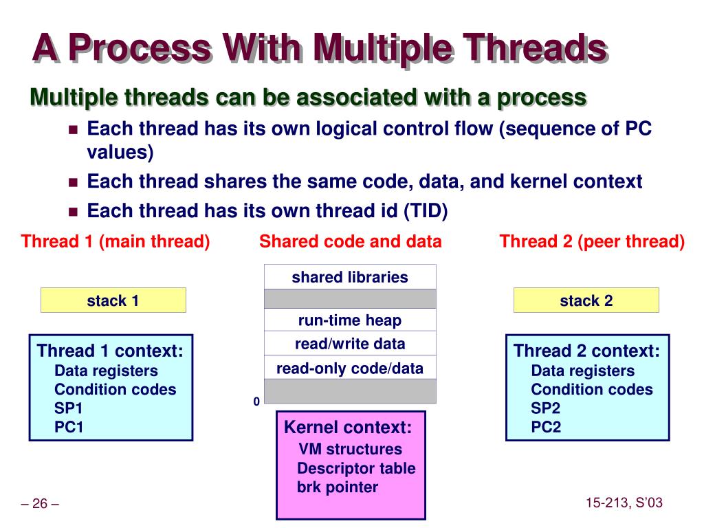 A Process With Multiple Threads • Multiple threads can be associated with a process • Each thread has its own logical control flow (sequence of PC values) • Each thread shares the same code, data, and kernel context • Each thread has its own thread id (TID) Thread 1 (main thread) Shared code and data Thread 2 (peer thread) shared libraries stack 1 stack 2 run-time heap read/write data Thread 1 context: Data registers Condition codes SP1 PC1 Thread 2 context: Data registers Condition codes SP2 PC2 read-only code/data 0 Kernel context: VM structures Descriptor table brk pointer