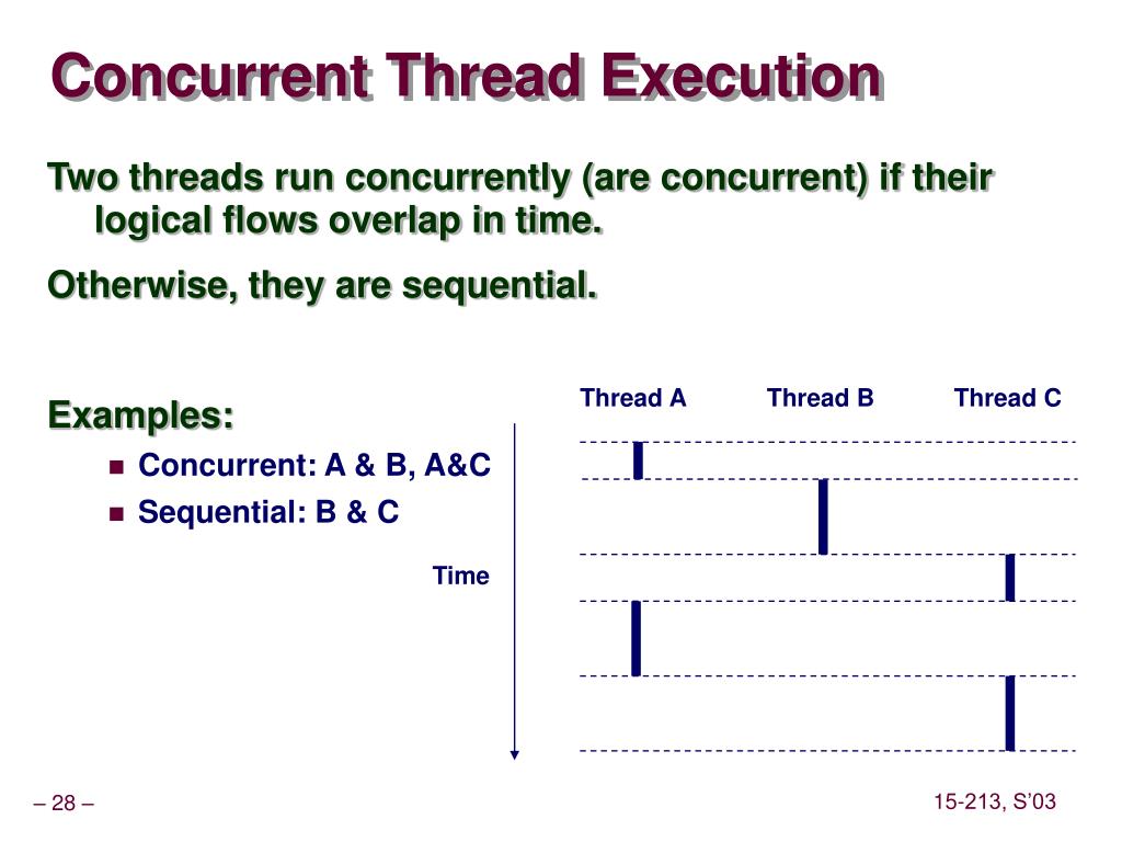 Concurrent Thread Execution • Two threads run concurrently (are concurrent) if their logical flows overlap in time. • Otherwise, they are sequential. • Examples: • Concurrent: A & B, A&C • Sequential: B & C Thread A Thread B Thread C Time