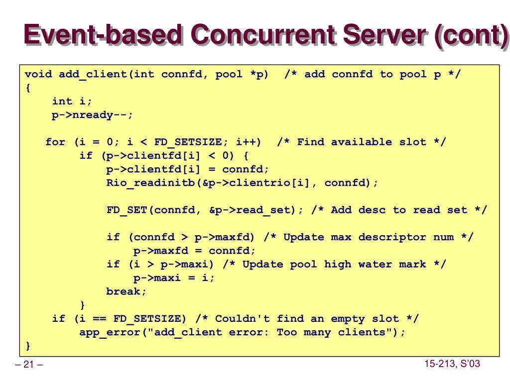 Event-based Concurrent Server (cont) void add_client(int connfd, pool *p) /* add connfd to pool p */ { int i; p->nready--; for (i = 0; i < FD_SETSIZE; i++) /* Find available slot */ if (p->clientfd[i] < 0) { p->clientfd[i] = connfd; Rio_readinitb(&p->clientrio[i], connfd); FD_SET(connfd, &p->read_set); /* Add desc to read set */ if (connfd > p->maxfd) /* Update max descriptor num */ p->maxfd = connfd; if (i > p->maxi) /* Update pool high water mark */ p->maxi = i; break; } if (i == FD_SETSIZE) /* Couldn't find an empty slot */ app_error("add_client error: Too many clients"); }