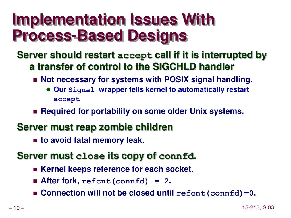 Implementation Issues With Process-Based Designs • Server should restart accept call if it is interrupted by a transfer of control to the SIGCHLD handler • Not necessary for systems with POSIX signal handling. • Our Signal wrapper tells kernel to automatically restart accept • Required for portability on some older Unix systems. • Server must reap zombie children • to avoid fatal memory leak. • Server must close its copy of connfd. • Kernel keeps reference for each socket. • After fork, refcnt(connfd) = 2. • Connection will not be closed until refcnt(connfd)=0.