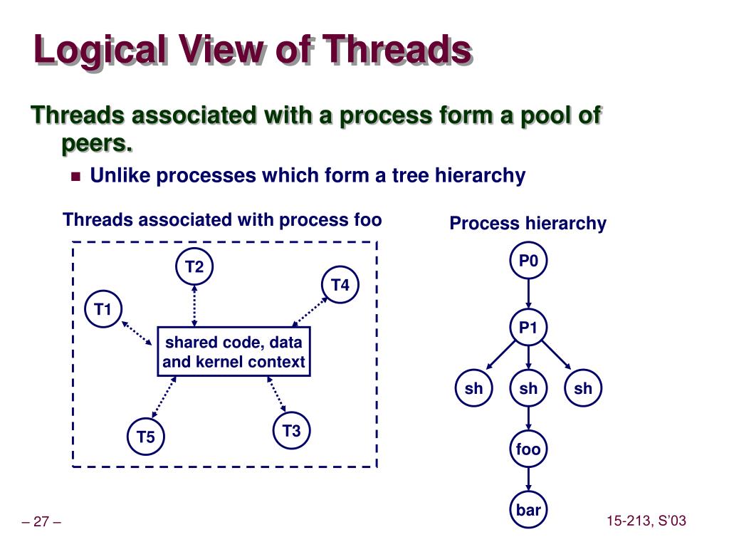 Logical View of Threads • Threads associated with a process form a pool of peers. • Unlike processes which form a tree hierarchy Threads associated with process foo Process hierarchy P0 T2 T4 T1 P1 shared code, data and kernel context sh sh sh T3 T5 foo bar