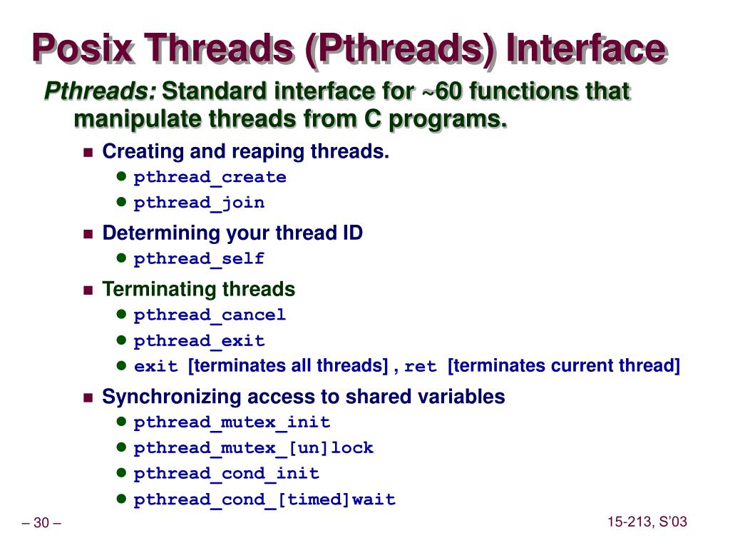 Posix Threads (Pthreads) Interface • Pthreads: Standard interface for ~60 functions that manipulate threads from C programs. • Creating and reaping threads. • pthread_create • pthread_join • Determining your thread ID • pthread_self • Terminating threads • pthread_cancel • pthread_exit • exit [terminates all threads] , ret [terminates current thread] • Synchronizing access to shared variables • pthread_mutex_init • pthread_mutex_[un]lock • pthread_cond_init • pthread_cond_[timed]wait
