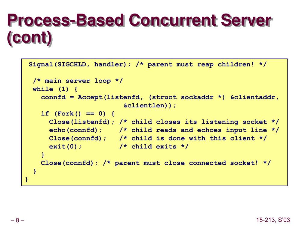 Process-Based Concurrent Server (cont) Signal(SIGCHLD, handler); /* parent must reap children! */ /* main server loop */ while (1) { connfd = Accept(listenfd, (struct sockaddr *) &clientaddr, &clientlen)); if (Fork() == 0) { Close(listenfd); /* child closes its listening socket */ echo(connfd); /* child reads and echoes input line */ Close(connfd); /* child is done with this client */ exit(0); /* child exits */ } Close(connfd); /* parent must close connected socket! */ } }
