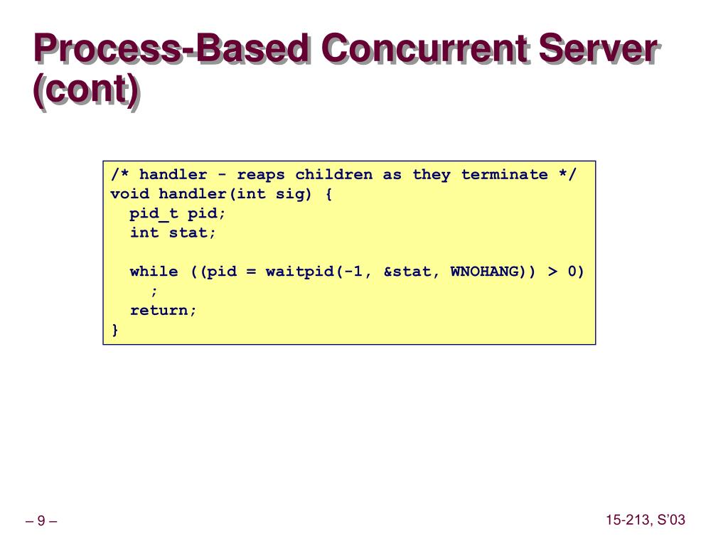 Process-Based Concurrent Server(cont) /* handler - reaps children as they terminate */ void handler(int sig) { pid_t pid; int stat; while ((pid = waitpid(-1, &stat, WNOHANG)) > 0) ; return; }