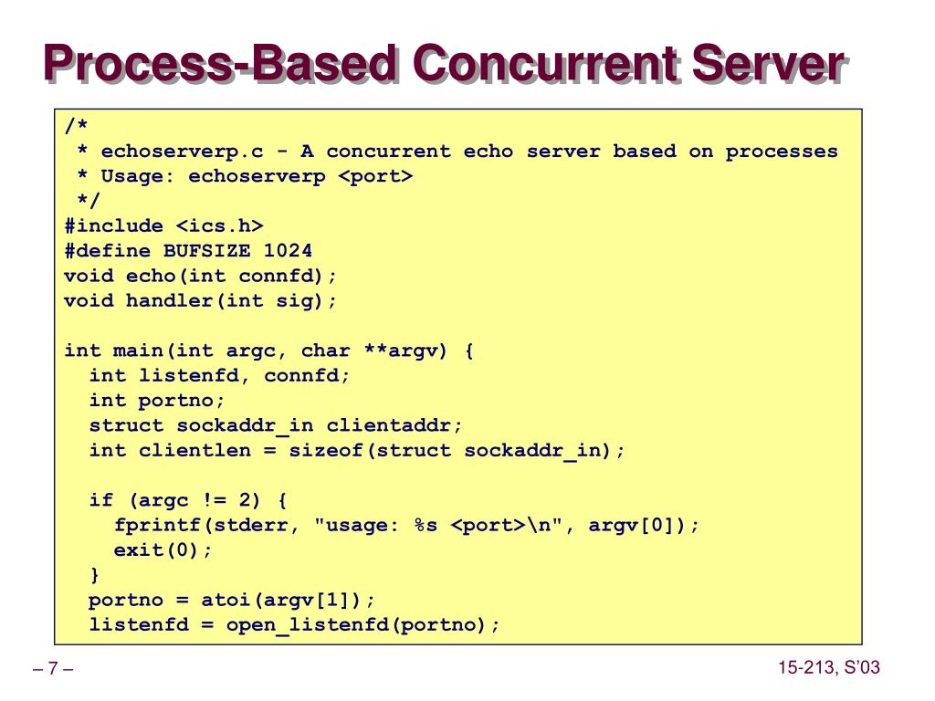 Process-Based Concurrent Server /* * echoserverp.c - A concurrent echo server based on processes * Usage: echoserverp <port> */ #include <ics.h> #define BUFSIZE 1024 void echo(int connfd); void handler(int sig); int main(int argc, char **argv) { int listenfd, connfd; int portno; struct sockaddr_in clientaddr; int clientlen = sizeof(struct sockaddr_in); if (argc != 2) { fprintf(stderr, "usage: %s <port>\n", argv[0]); exit(0); } portno = atoi(argv[1]); listenfd = open_listenfd(portno);