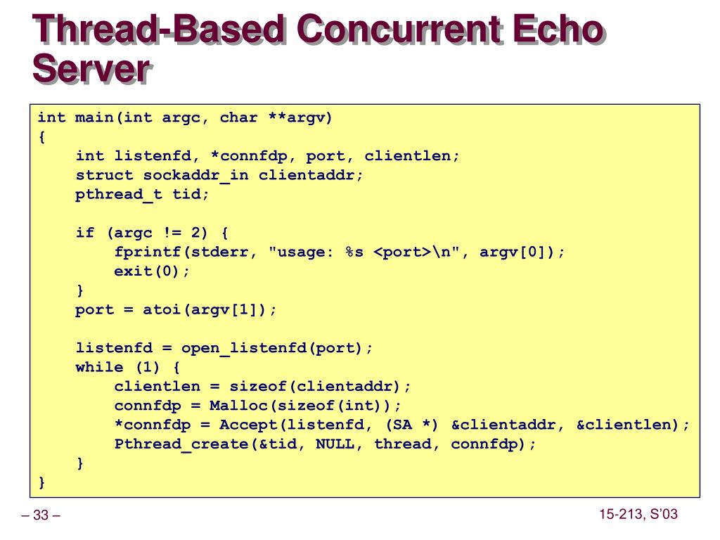 Thread-Based Concurrent Echo Server int main(int argc, char **argv) { int listenfd, *connfdp, port, clientlen; struct sockaddr_in clientaddr; pthread_t tid; if (argc != 2) { fprintf(stderr, "usage: %s <port>\n", argv[0]); exit(0); } port = atoi(argv[1]); listenfd = open_listenfd(port); while (1) { clientlen = sizeof(clientaddr); connfdp = Malloc(sizeof(int)); *connfdp = Accept(listenfd, (SA *) &clientaddr, &clientlen); Pthread_create(&tid, NULL, thread, connfdp); } }