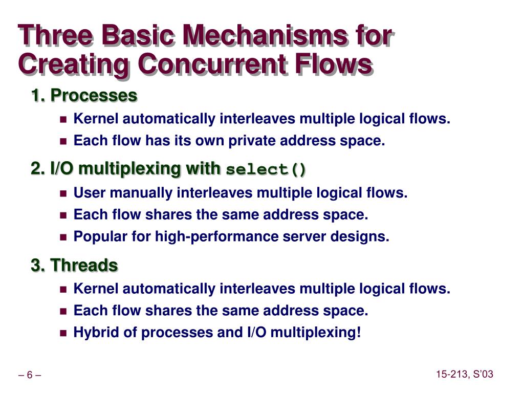 Three Basic Mechanisms for Creating Concurrent Flows • 1. Processes • Kernel automatically interleaves multiple logical flows. • Each flow has its own private address space. • 2. I/O multiplexing with select() • User manually interleaves multiple logical flows. • Each flow shares the same address space. • Popular for high-performance server designs. • 3. Threads • Kernel automatically interleaves multiple logical flows. • Each flow shares the same address space. • Hybrid of processes and I/O multiplexing!