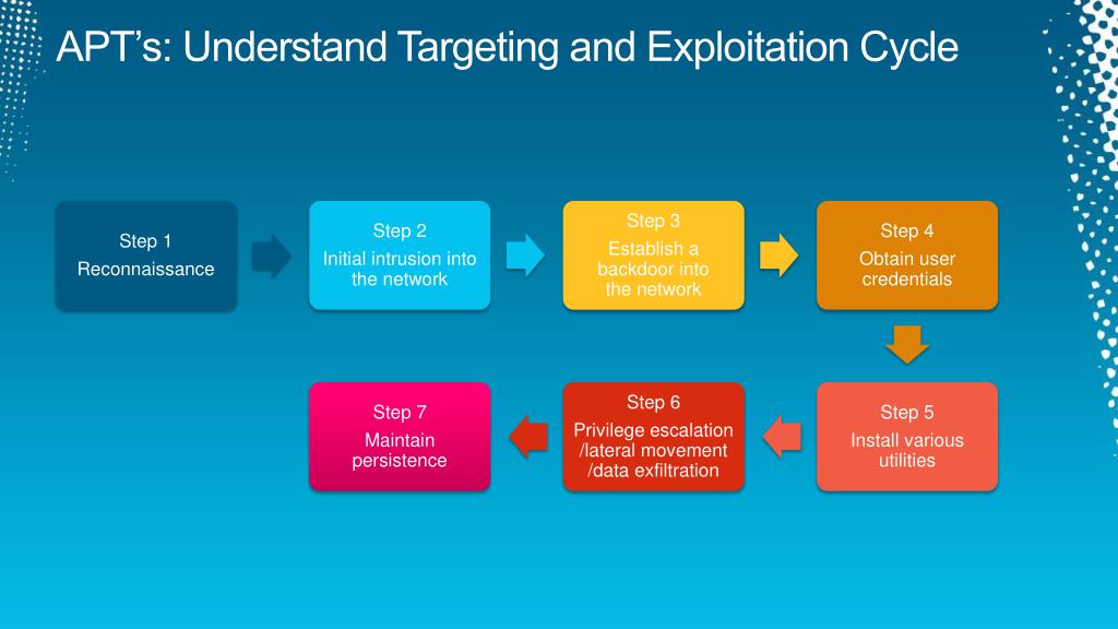 APT’s: Understand Targeting and Exploitation Cycle • Step 1 • Reconnaissance • Step 2 • Initial intrusion into the network • Step 3 • Establish a backdoor into the network • Step 4 • Obtain user credentials • Step 7 • Maintain persistence • Step 6 • Privilege escalation /lateral movement /data exfiltration • Step 5 • Install various utilities