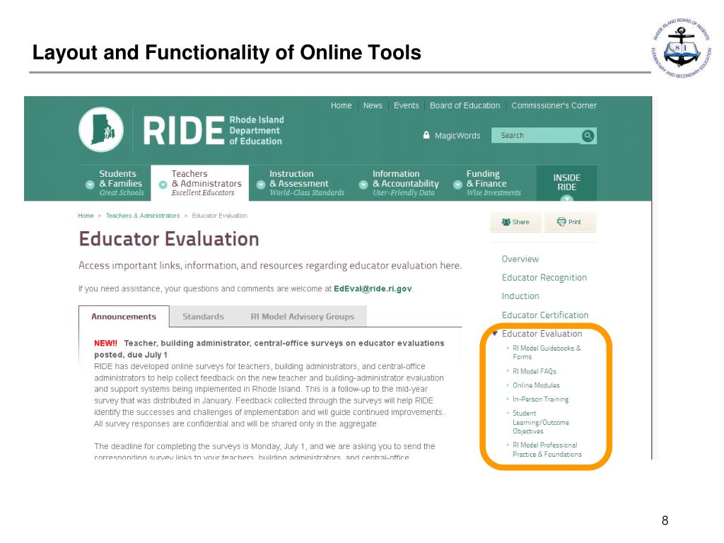 Rhode Island Educator Data Point Building Administrators surveyed expressed a desire for additional SLO-related training to focus on the following topics: Determining Rigor of Target on Student Learning Objectives 1st Supporting teachers in their Student Learning Objective writing 2nd Quality of Evidence and assessment-literacy 3rd RIDE Statewide Midyear Survey N = 400 building administrators