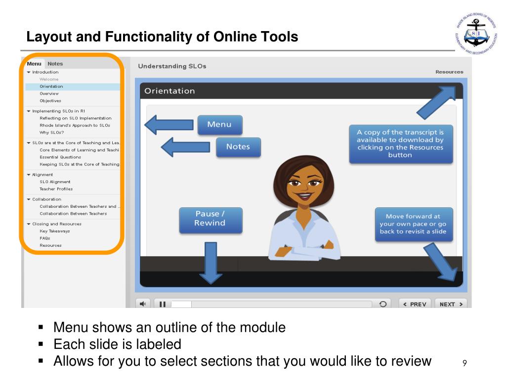 Layout and Functionality of Online Tools • Menu shows an outline of the module • Each slide is labeled • Allows for you to select sections that you would like to review