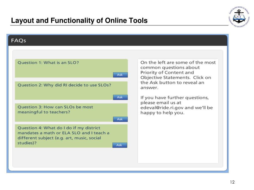 Updates to the SLO Form • Revised based on feedback • Framed with Essential Questions • Changes include: • Removing the Level of Standardization section (which was often confused with assessment quality) • Re-sequencing the order of the elements • Collapsing Evidence Source, Administration, and Scoring into one category p. 13