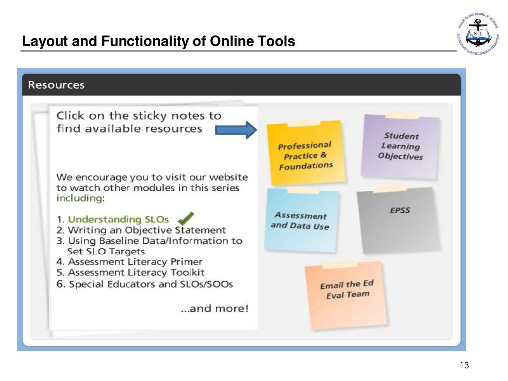 Introduction & Framing Session 1: Understanding SLOs Objectives: Evaluators will be able to: • Understand how SLOs are an integral part of curriculum, instruction, and assessment • Articulate key steps to take in order to implement SLOs successfully • Understand layout and functionality of all online tools