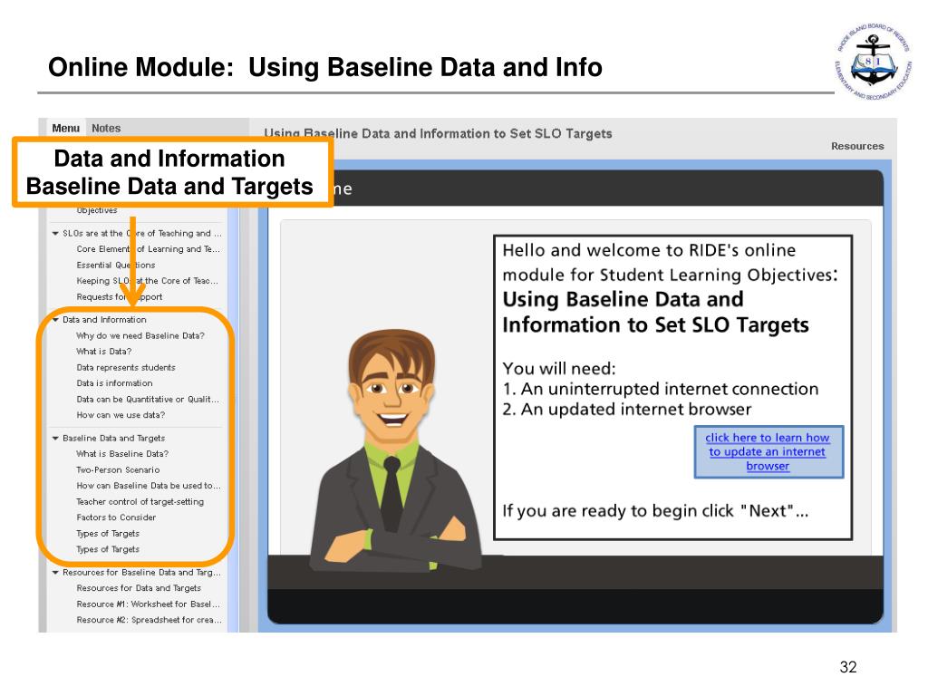 Using Baseline Data/Information To Set SLO Targets • Session 2: Using Baseline Data/Information to Set SLO Targets • Objectives: • Evaluators will be able to: • Understand the purpose of baseline data • Be able to identify several sources of baseline data • Understand how baseline data can be used to set targets ONLINE TOOLS 1. Using Baseline Data/Information To Set SLO Targets (online module)