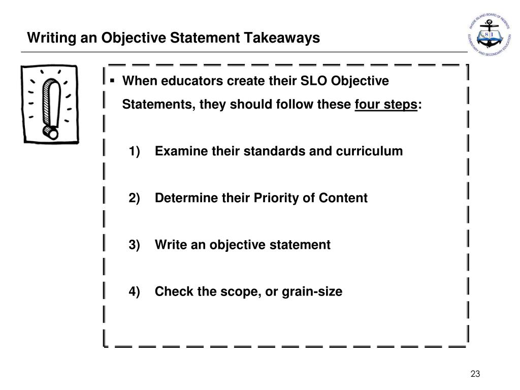 Writing an Objective Statement Takeaways • When educators create their SLO Objective Statements, they should follow these four steps: • Examine their standards and curriculum 2) Determine their Priority of Content 3) Write an objective statement 4) Check the scope, or grain-size