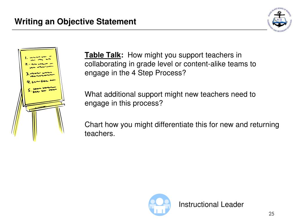 Writing an Objective Statement Table Talk: How might you support teachers in collaborating in grade level or content-alike teams to engage in the 4 Step Process? What additional support might new teachers need to engage in this process? Chart how you might differentiate this for new and returning teachers. Instructional Leader