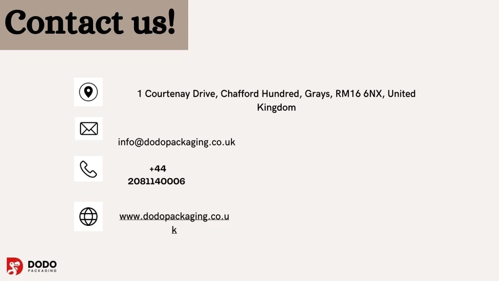 Contact us! 1 Courtenay Drive, Chafford Hundred, Grays, RM16 6NX, United Kingdom info@dodopackaging.co.uk +44 2081140006 www.dodopackaging.co.uk