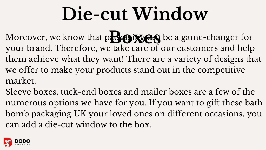 Die-cut Window Boxes Moreover, we know that packaging can be a game-changer for your brand. Therefore, we take care of our customers and help them achieve what they want! There are a variety of designs that we offer to make your products stand out in the competitive market. Sleeve boxes, tuck-end boxes and mailer boxes are a few of the numerous options we have for you. If you want to gift these bath bomb packaging UK your loved ones on different occasions, you can add a die-cut window to the box.