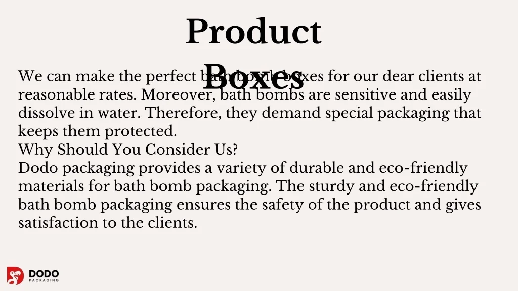 Product Boxes We can make the perfect bath bomb boxes for our dear clients at reasonable rates. Moreover, bath bombs are sensitive and easily dissolve in water. Therefore, they demand special packaging that keeps them protected. Why Should You Consider Us? Dodo packaging provides a variety of durable and eco-friendly materials for bath bomb packaging. The sturdy and eco-friendly bath bomb packaging ensures the safety of the product and gives satisfaction to the clients.