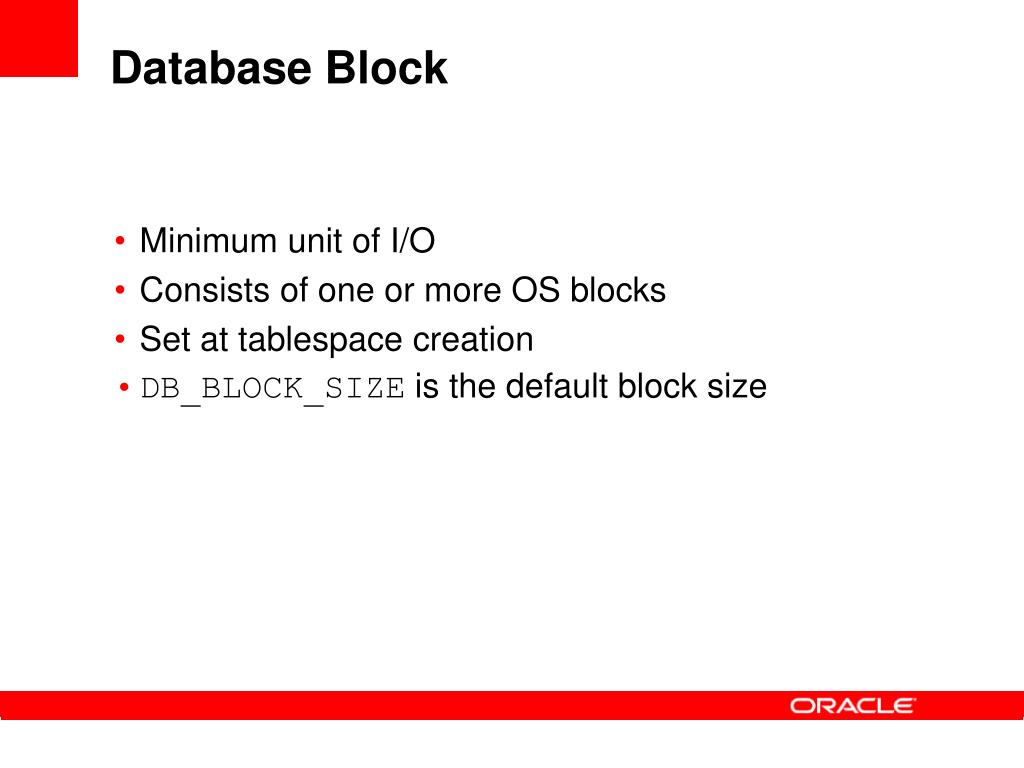 Database Block • Minimum unit of I/O • Consists of one or more OS blocks • Set at tablespace creation • DB_BLOCK_SIZE is the default block size