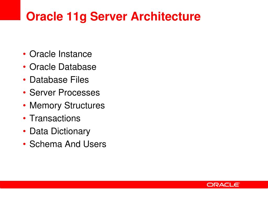 Database Architecture Overview. Oracle 11g Server Architecture. Oracle Instance Oracle Database Database Files Server Processes Memory Structures Transactions Data Dictionary Schema And Users. Oracle Server Architecture. An Oracle server: