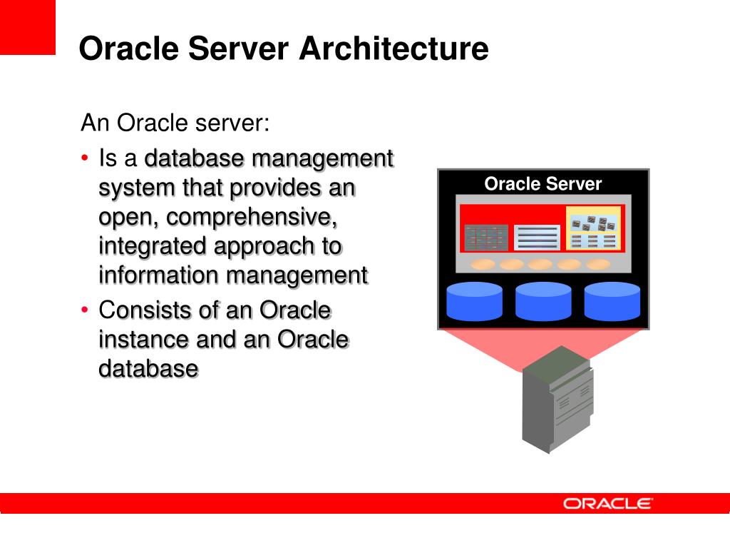 Oracle Server Architecture An Oracle server: • Is a database management system that provides an open, comprehensive, integrated approach to information management • Consists of an Oracle instance and an Oracle database Oracle Server