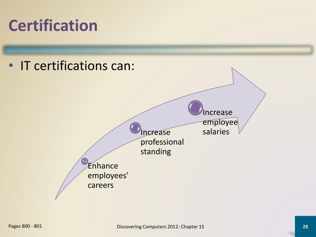 Certification • IT certifications can: Discovering Computers 2012: Chapter 15 Pages 800 - 801