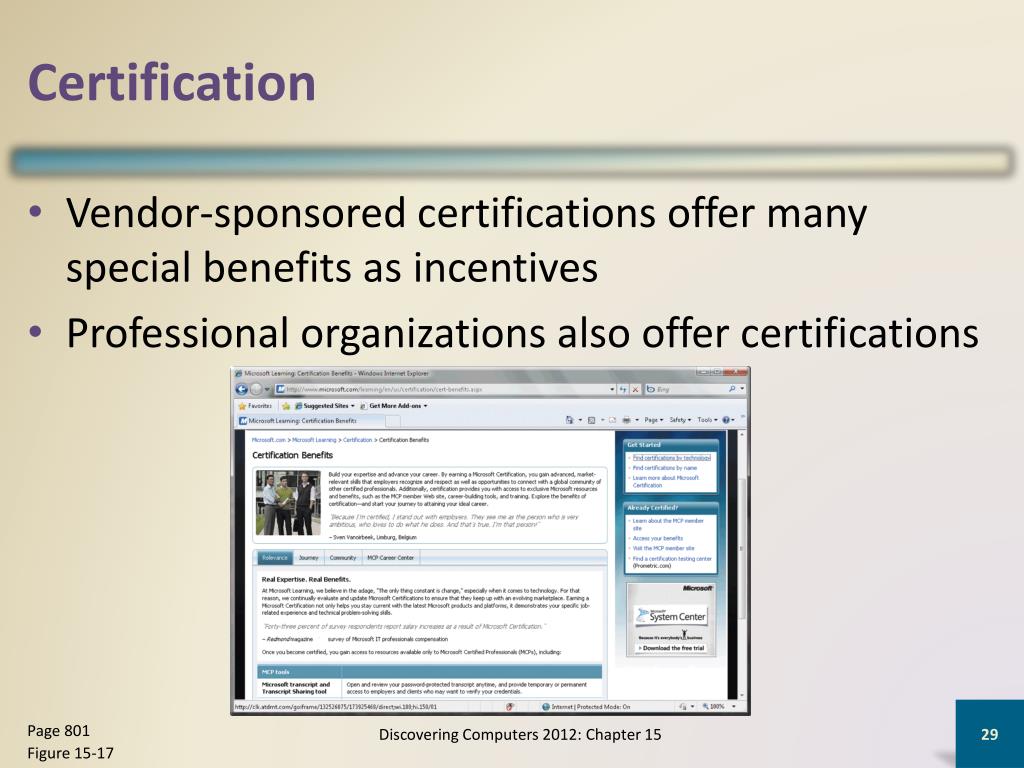 Certification • Vendor-sponsored certifications offer many special benefits as incentives • Professional organizations also offer certifications Discovering Computers 2012: Chapter 15 Page 801 Figure 15-17