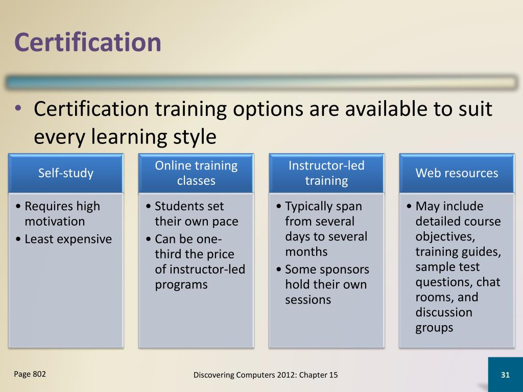Certification • Certification training options are available to suit every learning style Discovering Computers 2012: Chapter 15 Page 802