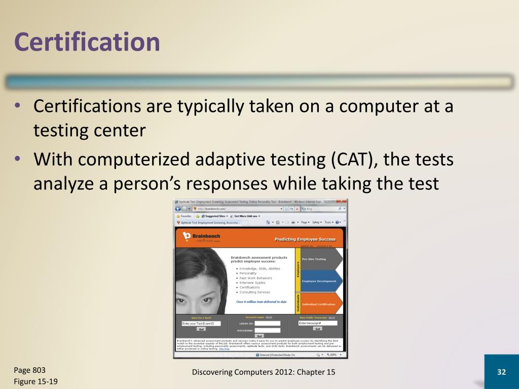 Certification • Certifications are typically taken on a computer at a testing center • With computerized adaptive testing (CAT), the tests analyze a person’s responses while taking the test Discovering Computers 2012: Chapter 15 Page 803 Figure 15-19