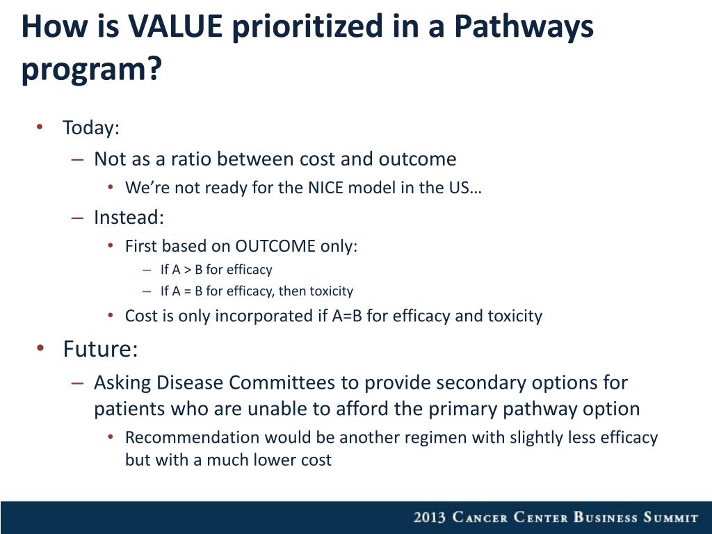 How is VALUE prioritized in a Pathways program? • Today: • Not as a ratio between cost and outcome • We’re not ready for the NICE model in the US… • Instead: • First based on OUTCOME only: • If A > B for efficacy • If A = B for efficacy, then toxicity • Cost is only incorporated if A=B for efficacy and toxicity • Future: • Asking Disease Committees to provide secondary options for patients who are unable to afford the primary pathway option • Recommendation would be another regimen with slightly less efficacy but with a much lower cost