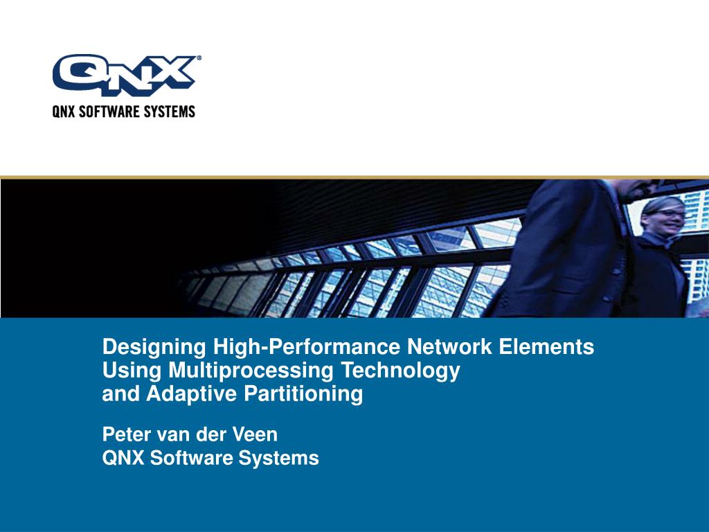 Designing High-Performance Network Elements Using Multiprocessing Technology and Adaptive Partitioning. Peter van der Veen QNX Software Systems. Typical Hardware Architecture. Chassis. Network. Network. Network. Line card. Low-speed bus. High-speed interconnect. Control card. Network.