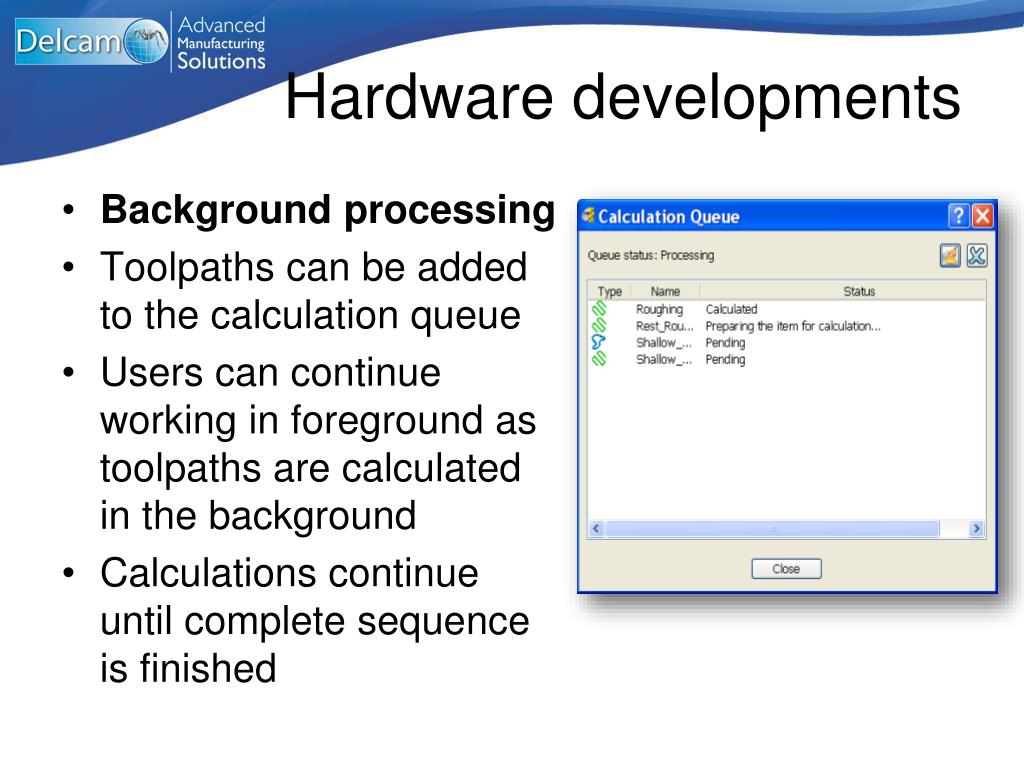 Hardware developments • Background processing • Toolpaths can be added to the calculation queue • Users can continue working in foreground as toolpaths are calculated in the background • Calculations continue until complete sequence is finished