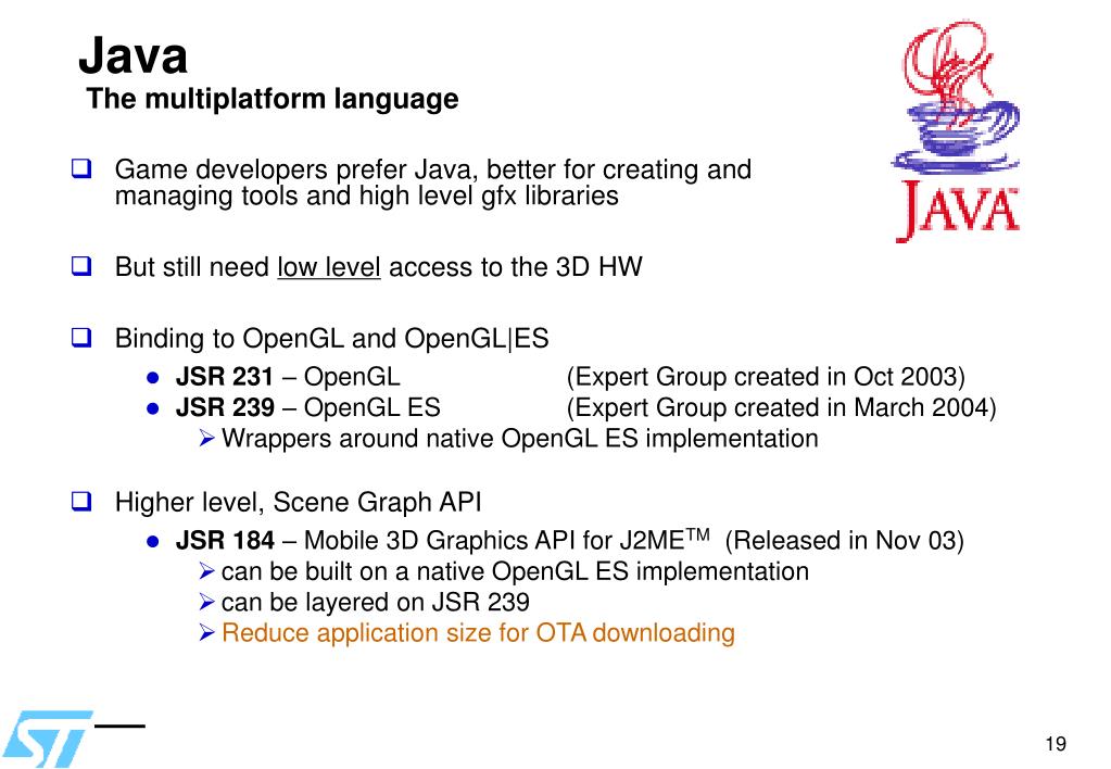Java The multiplatform language • Game developers prefer Java, better for creating and managing tools and high level gfx libraries • But still need low level access to the 3D HW • Binding to OpenGL and OpenGL|ES • JSR 231 – OpenGL (Expert Group created in Oct 2003) • JSR 239 – OpenGL ES (Expert Group created in March 2004) • Wrappers around native OpenGL ES implementation • Higher level, Scene Graph API • JSR 184 – Mobile 3D Graphics API for J2METM (Released in Nov 03) • can be built on a native OpenGL ES implementation • can be layered on JSR 239 • Reduce application size for OTA downloading