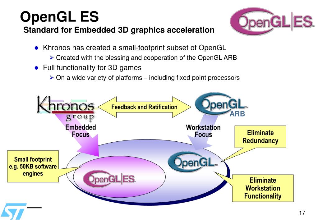 OpenGL ESStandard for Embedded 3D graphics acceleration • Khronos has created a small-footprint subset of OpenGL • Created with the blessing and cooperation of the OpenGL ARB • Full functionality for 3D games • On a wide variety of platforms – including fixed point processors Feedback and Ratification ARB EmbeddedFocus WorkstationFocus Eliminate Redundancy Small footprint e.g. 50KB software engines Eliminate Workstation Functionality