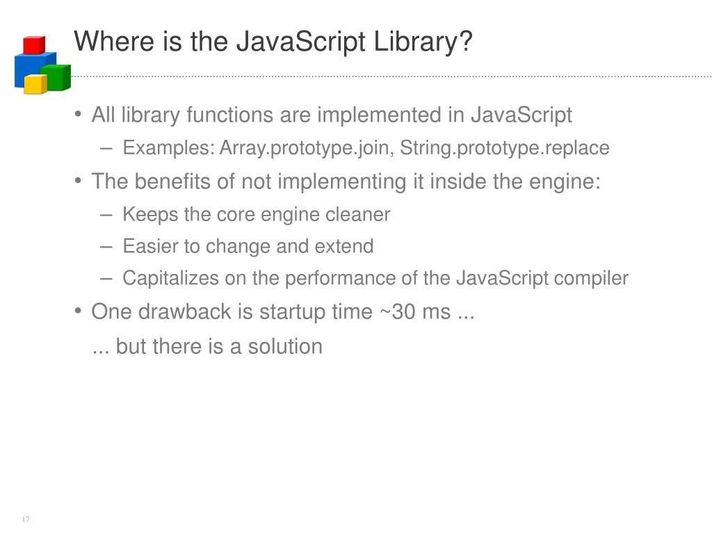 Where is the JavaScript Library? • All library functions are implemented in JavaScript • Examples: Array.prototype.join, String.prototype.replace • The benefits of not implementing it inside the engine: • Keeps the core engine cleaner • Easier to change and extend • Capitalizes on the performance of the JavaScript compiler • One drawback is startup time ~30 ms ... ... but there is a solution