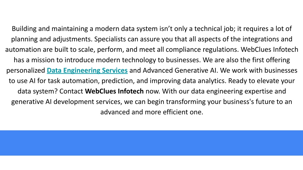 Building and maintaining a modern data system isn’t only a technical job; it requires a lot of planning and adjustments. Specialists can assure you that all aspects of the integrations and automation are built to scale, perform, and meet all compliance regulations. WebClues Infotech has a mission to introduce modern technology to businesses. We are also the first offering personalized Data Engineering Services and Advanced Generative AI. We work with businesses to use AI for task automation, prediction, and improving data analytics. Ready to elevate your data system? Contact WebClues Infotech now. With our data engineering expertise and generative AI development services, we can begin transforming your business's future to an advanced and more efficient one.