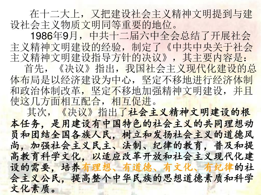 在十二大上,又把建设社会主义精神文明提到与建设社会主义物质文明同等重要的地位。在十二大上,又把建设社会主义精神文明提到与建设社会主义物质文明同等重要的地位。 1986年9月,中共十二届六中全会总结了开展社会主义精神文明建设的经验,制定了《中共中央关于社会主义精神文明建设指导方针的决议》,其主要内容是: 首先,《决议》指出,我国社会主义现代化建设的总体布局是以经济建设为中心,坚定不移地进行经济体制和政治体制改革,坚定不移地加强精神文明建设,并且使这几方面相互配合,相互促进。 其次,《决议》指出了社会主义精神文明建设的根本任务,是用建设有中国特色的社会主义的共同理想动员和团结全国各族人民,树立和发扬社会主义的道德风尚,加强社会主义民主、法制、纪律的教育,普及和提高教育科学文化,以适应改革开放和社会主义现代化建设的需要,培养有理想、有道德、有文化、有纪律的社会主义公民,提高整个中华民族的思想道德素质和科学文化素质。