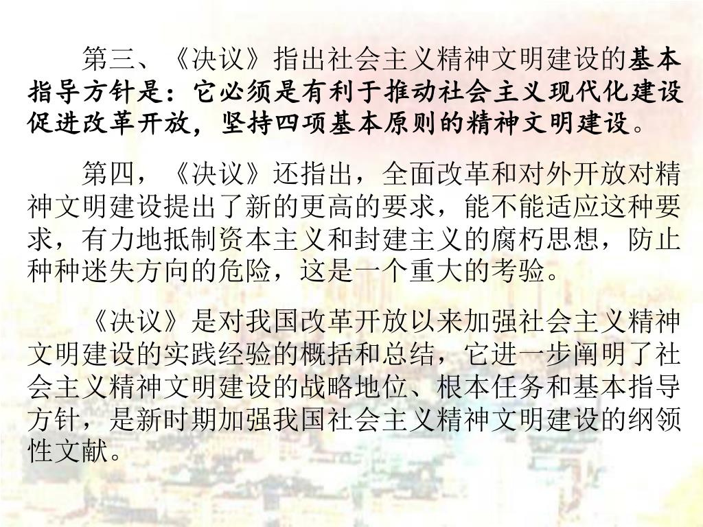 第三、《决议》指出社会主义精神文明建设的基本指导方针是:它必须是有利于推动社会主义现代化建设促进改革开放,坚持四项基本原则的精神文明建设。 第三、《决议》指出社会主义精神文明建设的基本指导方针是:它必须是有利于推动社会主义现代化建设促进改革开放,坚持四项基本原则的精神文明建设。 第四,《决议》还指出,全面改革和对外开放对精神文明建设提出了新的更高的要求,能不能适应这种要求,有力地抵制资本主义和封建主义的腐朽思想,防止种种迷失方向的危险,这是一个重大的考验。 《决议》是对我国改革开放以来加强社会主义精神文明建设的实践经验的概括和总结,它进一步阐明了社会主义精神文明建设的战略地位、根本任务和基本指导方针,是新时期加强我国社会主义精神文明建设的纲领性文献。