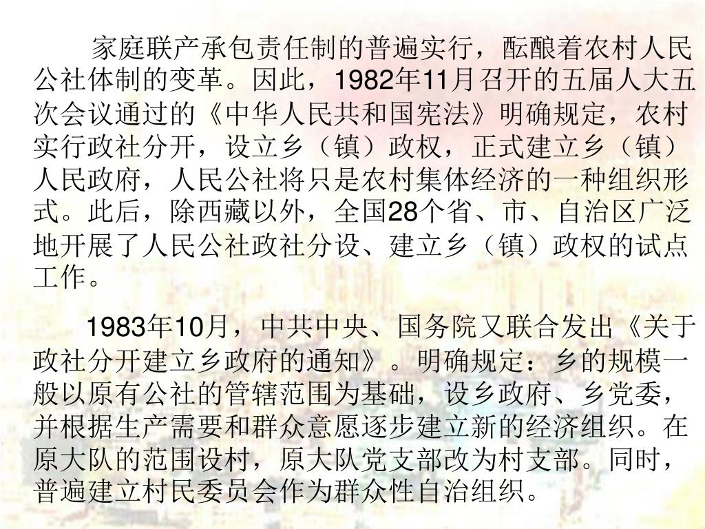 家庭联产承包责任制的普遍实行,酝酿着农村人民公社体制的变革。因此,1982年11月召开的五届人大五次会议通过的《中华人民共和国宪法》明确规定,农村实行政社分开,设立乡(镇)政权,正式建立乡(镇)人民政府,人民公社将只是农村集体经济的一种组织形式。此后,除西藏以外,全国28个省、市、自治区广泛地开展了人民公社政社分设、建立乡(镇)政权的试点工作。家庭联产承包责任制的普遍实行,酝酿着农村人民公社体制的变革。因此,1982年11月召开的五届人大五次会议通过的《中华人民共和国宪法》明确规定,农村实行政社分开,设立乡(镇)政权,正式建立乡(镇)人民政府,人民公社将只是农村集体经济的一种组织形式。此后,除西藏以外,全国28个省、市、自治区广泛地开展了人民公社政社分设、建立乡(镇)政权的试点工作。 1983年10月,中共中央、国务院又联合发出《关于政社分开建立乡政府的通知》。明确规定:乡的规模一般以原有公社的管辖范围为基础,设乡政府、乡党委,并根据生产需要和群众意愿逐步建立新的经济组织。在原大队的范围设村,原大队党支部改为村支部。同时,普遍建立村民委员会作为群众性自治组织。