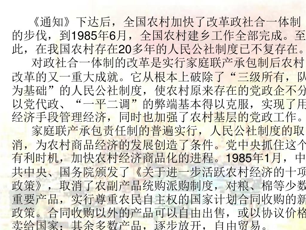 《通知》下达后,全国农村加快了改革政社合一体制的步伐,到1985年6月,全国农村建乡工作全部完成。至此,在我国农村存在20多年的人民公社制度已不复存在。 对政社合一体制的改革是实行家庭联产承包制后农村改革的又一重大成就。它从根本上破除了“三级所有,队为基础”的人民公社制度,使农村原来存在的党政企不分、以党代政、“一平二调”的弊端基本得以克服,实现了用经济手段管理经济,同时也加强了农村基层的党政工作。 家庭联产承包责任制的普遍实行,人民公社制度的取消,为农村商品经济的发展创造了条件。党中央抓住这个有利时机,加快农村经济商品化的进程。1985年1月,中共中央、国务院颁发了《关于进一步活跃农村经济的十项政策》,取消了农副产品统购派购制度,对粮、棉等少数重要产品,实行尊重农民自主权的国家计划合同收购的新政策。合同收购以外的产品可以自由出售,或以协议价格卖给国家;其余多数产品,逐步放开,自由贸易。