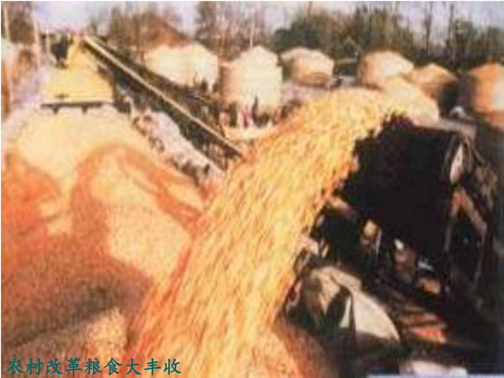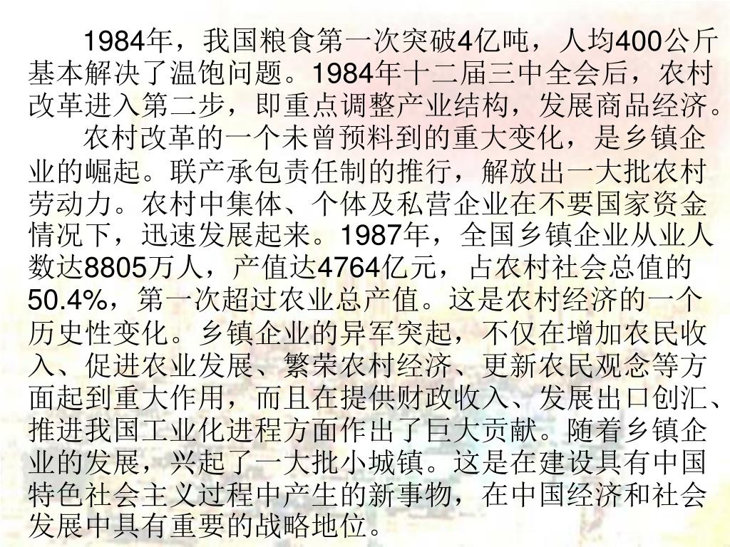 1984年,我国粮食第一次突破4亿吨,人均400公斤基本解决了温饱问题。1984年十二届三中全会后,农村改革进入第二步,即重点调整产业结构,发展商品经济。 农村改革的一个未曾预料到的重大变化,是乡镇企业的崛起。联产承包责任制的推行,解放出一大批农村劳动力。农村中集体、个体及私营企业在不要国家资金情况下,迅速发展起来。1987年,全国乡镇企业从业人数达8805万人,产值达4764亿元,占农村社会总值的50.4%,第一次超过农业总产值。这是农村经济的一个历史性变化。乡镇企业的异军突起,不仅在增加农民收入、促进农业发展、繁荣农村经济、更新农民观念等方面起到重大作用,而且在提供财政收入、发展出口创汇、推进我国工业化进程方面作出了巨大贡献。随着乡镇企业的发展,兴起了一大批小城镇。这是在建设具有中国特色社会主义过程中产生的新事物,在中国经济和社会发展中具有重要的战略地位。