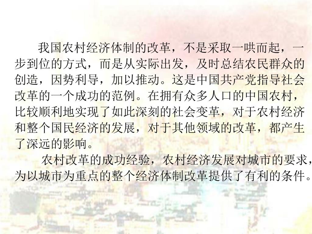 我国农村经济体制的改革,不是采取一哄而起,一步到位的方式,而是从实际出发,及时总结农民群众的创造,因势利导,加以推动。这是中国共产党指导社会改革的一个成功的范例。在拥有众多人口的中国农村,比较顺利地实现了如此深刻的社会变革,对于农村经济和整个国民经济的发展,对于其他领域的改革,都产生了深远的影响。我国农村经济体制的改革,不是采取一哄而起,一步到位的方式,而是从实际出发,及时总结农民群众的创造,因势利导,加以推动。这是中国共产党指导社会改革的一个成功的范例。在拥有众多人口的中国农村,比较顺利地实现了如此深刻的社会变革,对于农村经济和整个国民经济的发展,对于其他领域的改革,都产生了深远的影响。 农村改革的成功经验,农村经济发展对城市的要求,为以城市为重点的整个经济体制改革提供了有利的条件。