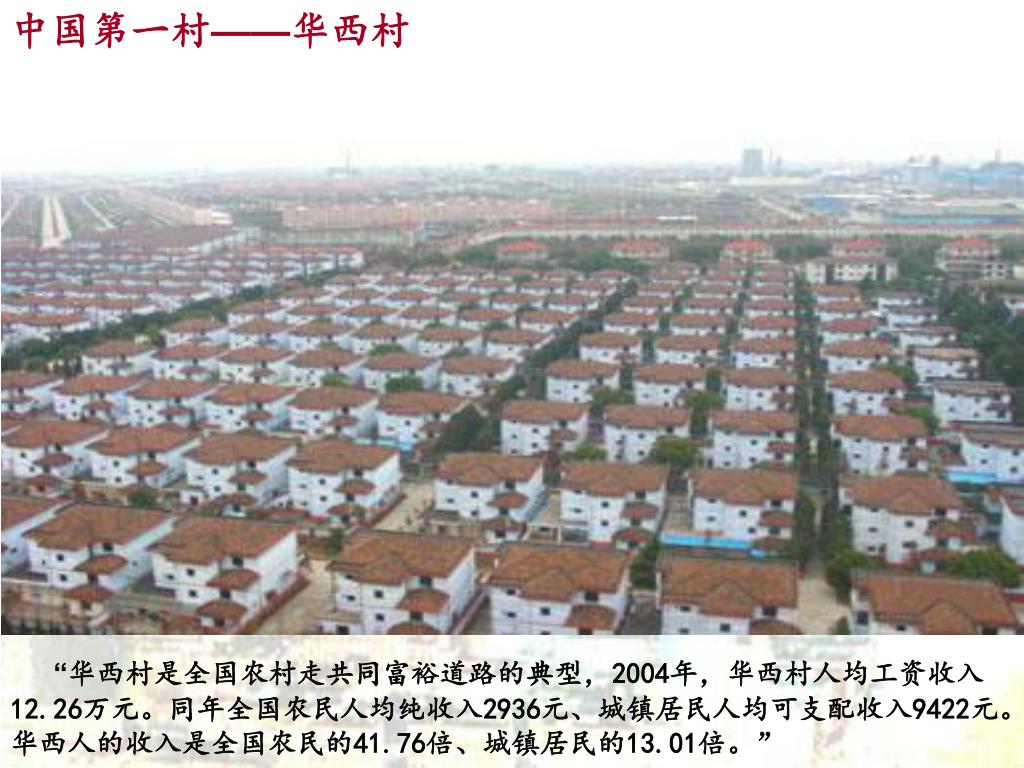 中国第一村——华西村 “华西村是全国农村走共同富裕道路的典型,2004年,华西村人均工资收入12.26万元。同年全国农民人均纯收入2936元、城镇居民人均可支配收入9422元。华西人的收入是全国农民的41.76倍、城镇居民的13.01倍。”