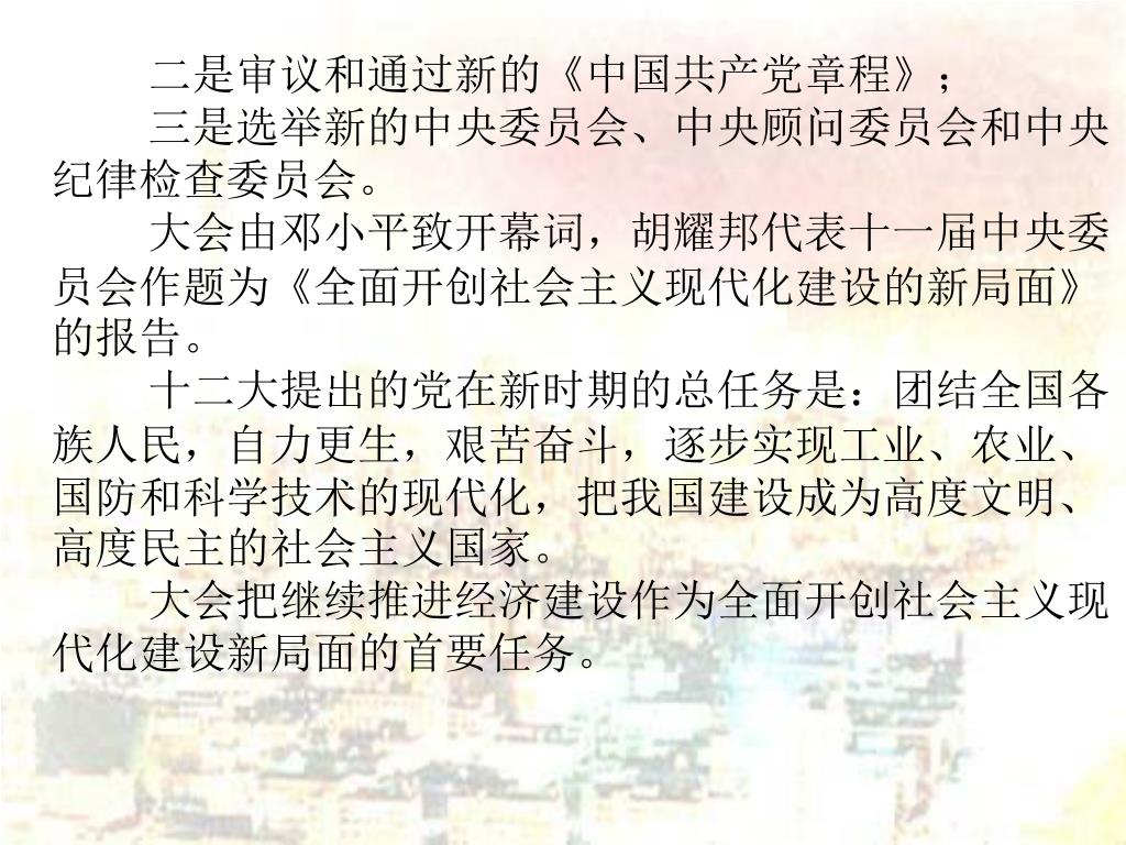 二是审议和通过新的《中国共产党章程》; 三是选举新的中央委员会、中央顾问委员会和中央纪律检查委员会。 大会由邓小平致开幕词,胡耀邦代表十一届中央委员会作题为《全面开创社会主义现代化建设的新局面》的报告。 十二大提出的党在新时期的总任务是:团结全国各族人民,自力更生,艰苦奋斗,逐步实现工业、农业、国防和科学技术的现代化,把我国建设成为高度文明、高度民主的社会主义国家。 大会把继续推进经济建设作为全面开创社会主义现代化建设新局面的首要任务。