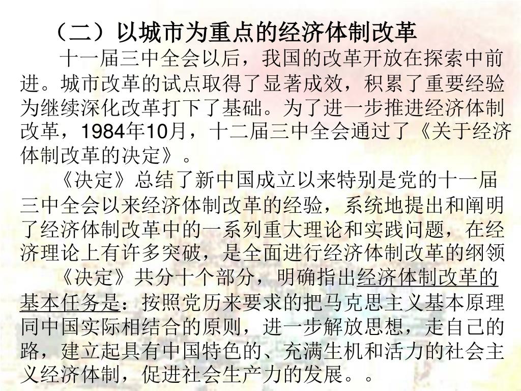 (二)以城市为重点的经济体制改革 十一届三中全会以后,我国的改革开放在探索中前进。城市改革的试点取得了显著成效,积累了重要经验为继续深化改革打下了基础。为了进一步推进经济体制改革,1984年10月,十二届三中全会通过了《关于经济体制改革的决定》。 《决定》总结了新中国成立以来特别是党的十一届三中全会以来经济体制改革的经验,系统地提出和阐明了经济体制改革中的一系列重大理论和实践问题,在经济理论上有许多突破,是全面进行经济体制改革的纲领 《决定》共分十个部分,明确指出经济体制改革的基本任务是:按照党历来要求的把马克思主义基本原理同中国实际相结合的原则,进一步解放思想,走自己的路,建立起具有中国特色的、充满生机和活力的社会主义经济体制,促进社会生产力的发展。。