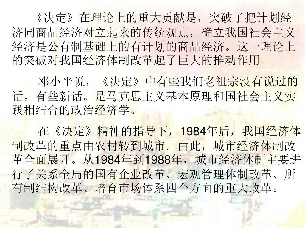 《决定》在理论上的重大贡献是,突破了把计划经济同商品经济对立起来的传统观点,确立我国社会主义经济是公有制基础上的有计划的商品经济。这一理论上的突破对我国经济体制改革起了巨大的推动作用。 邓小平说,《决定》中有些我们老祖宗没有说过的话,有些新话。是马克思主义基本原理和国社会主义实践相结合的政治经济学。 在《决定》精神的指导下,1984年后,我国经济体制改革的重点由农村转到城市。由此,城市经济体制改革全面展开。从1984年到1988年,城市经济体制主要进行了关系全局的国有企业改革、宏观管理体制改革、所有制结构改革、培育市场体系四个方面的重大改革。